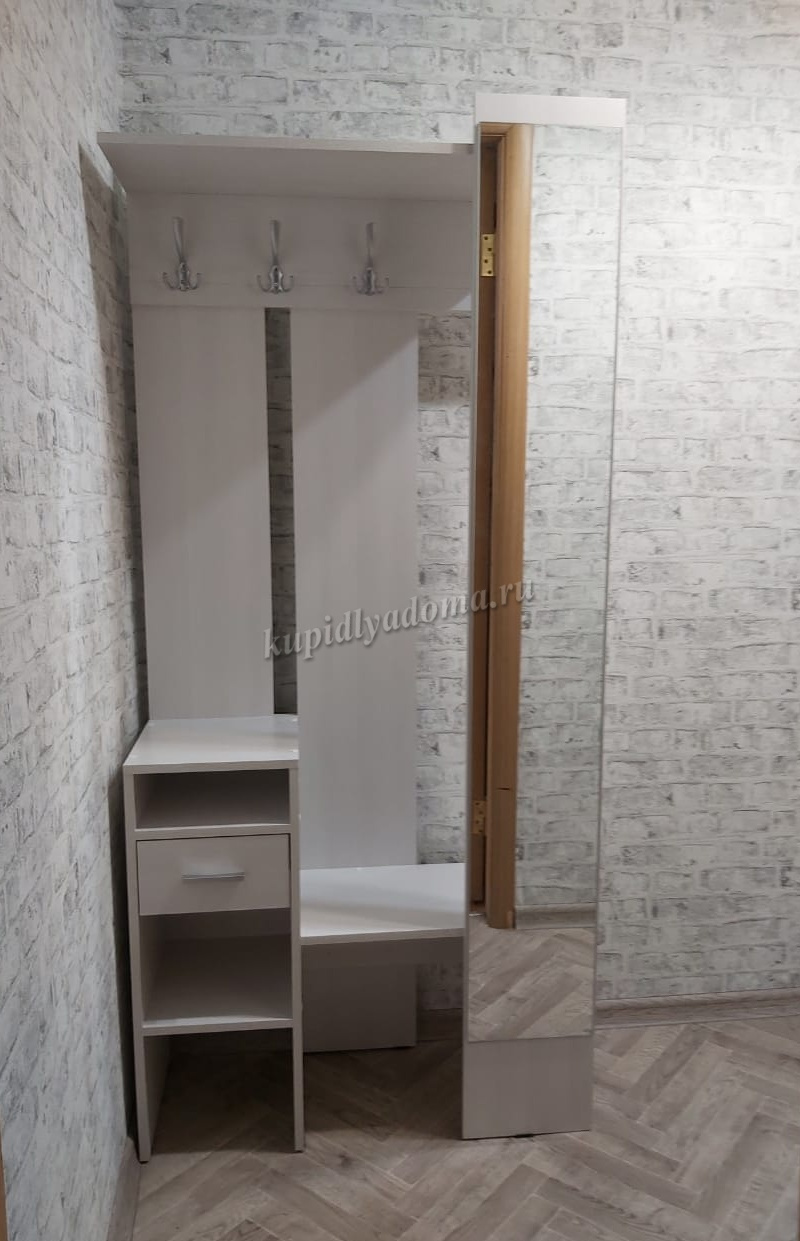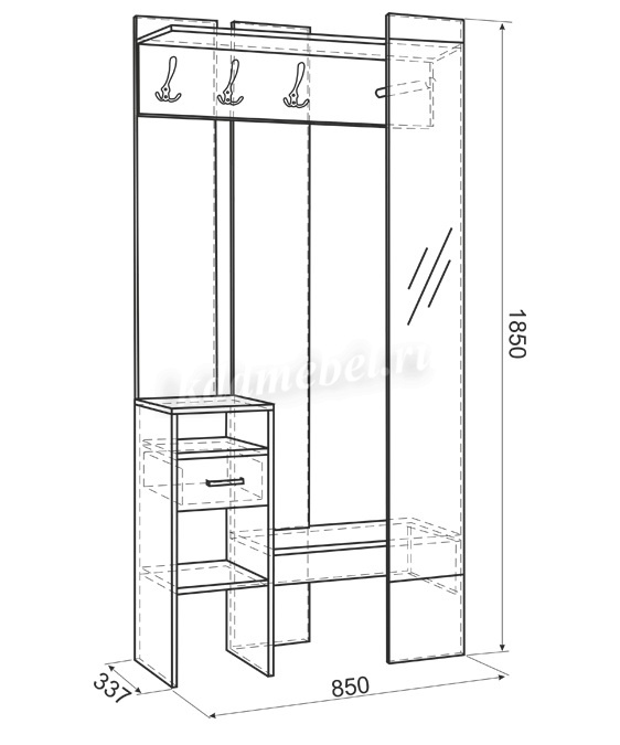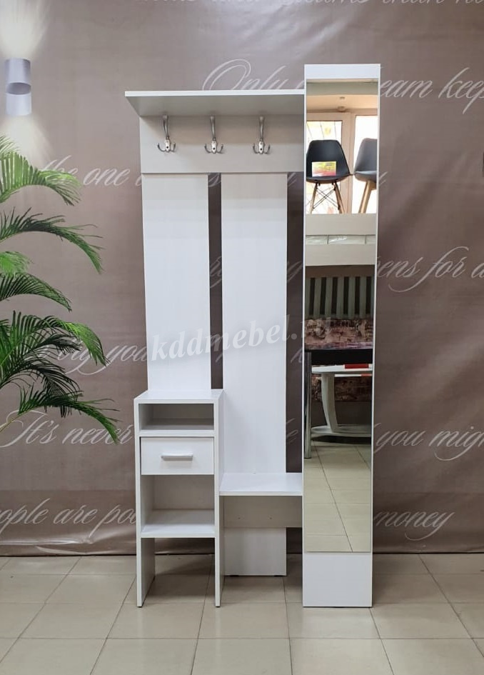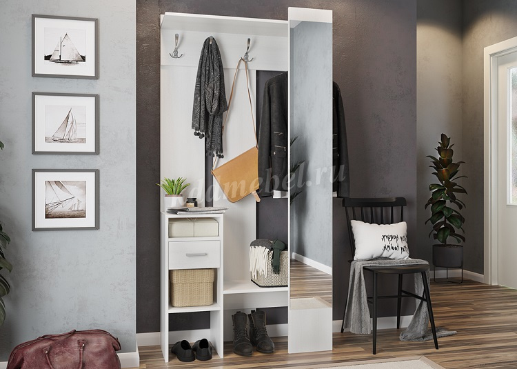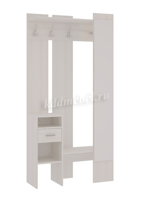 «Агата» создана для Вашей прихожей – Вы можете повесить одежду и сумку на металлические крючки, шляпки положить на полку сверху, нужные мелочи – в выдвижной ящик. На открытых полках можно разместить зонты, перчатки и шарфы. Лицевая панель с зеркалом во весь рост обеспечит комфорт и уют Вашей прихожей. «Агата» - стильная, функциональная, занимает минимум пространства.