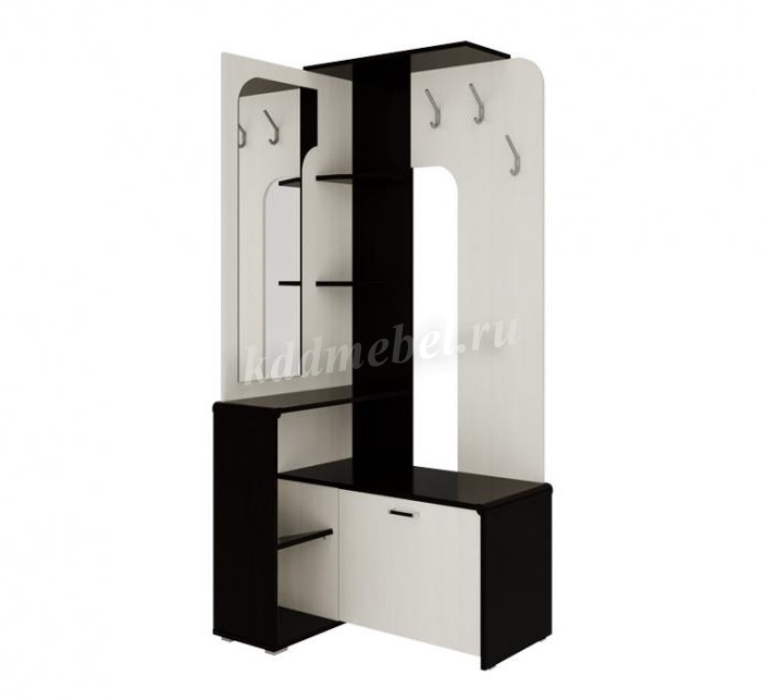 Компактная и достаточно вместительная прихожая с оригинальным угловым дизайном. В конструкции предусмотрено всё необходимое для хранения верхней одежды, обуви, аксессуаров.