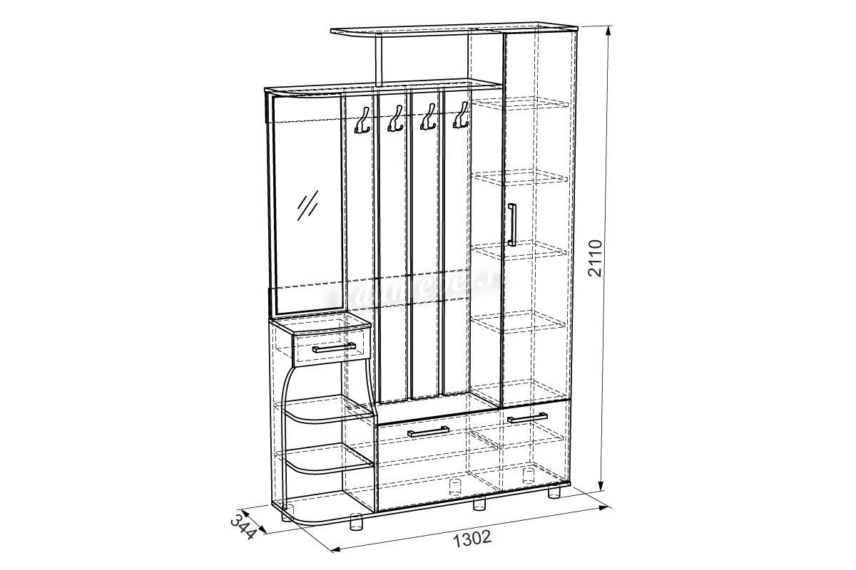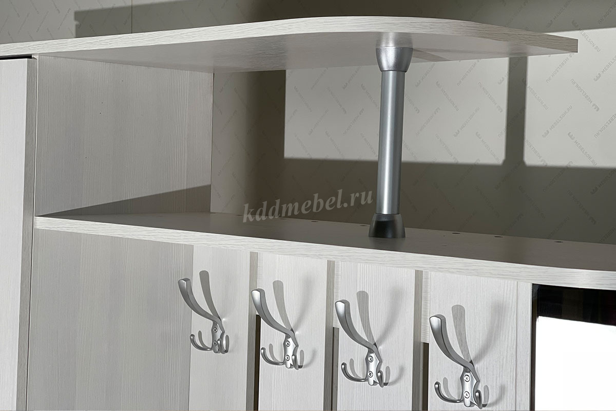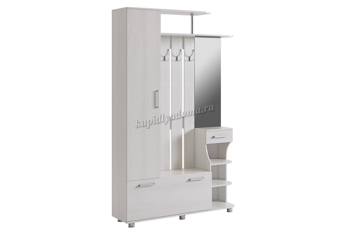 Состоит из: шкафа с полками, вешалки с крючками для одежды и сумок, обувницы, открытых полок, зеркала, полки для головных уборов, выдвижного ящика. Сборка универсальная.