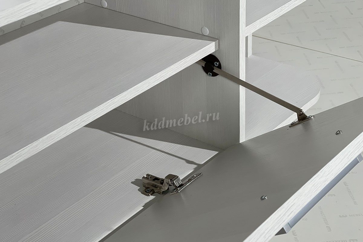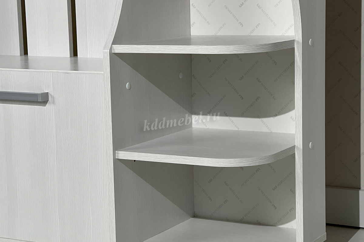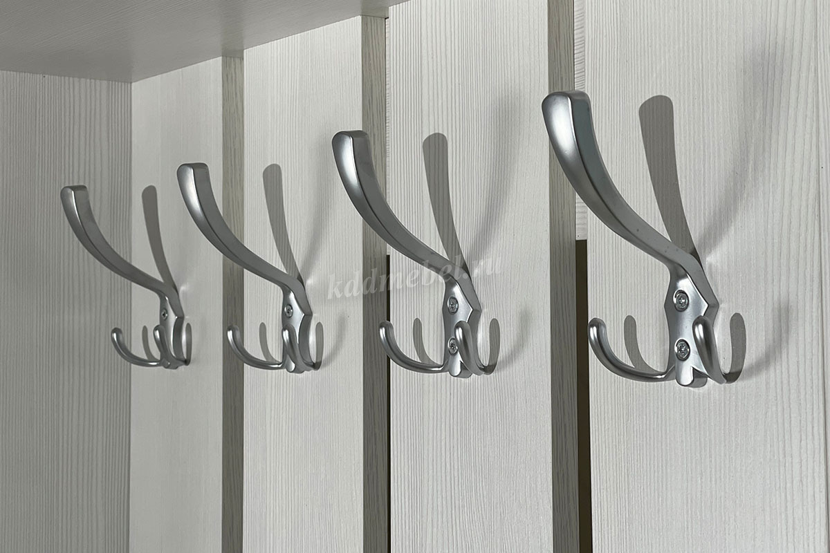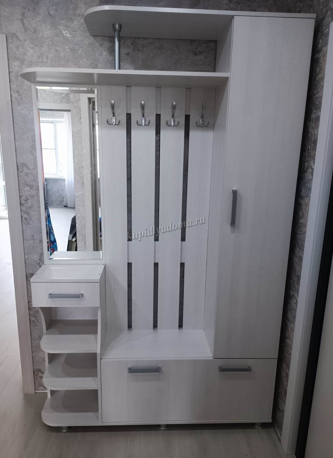Состоит из: шкафа с полками, вешалки с крючками для одежды и сумок, обувницы, открытых полок, зеркала, полки для головных уборов, выдвижного ящика. Сборка универсальная.