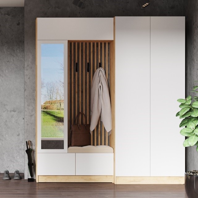Состоит из функциональной центральной части, полноценного шкафа с полками и штангой, торцевого завершения. Все эти элементы объединяются в единую стильную и современную систему хранения для вещей.