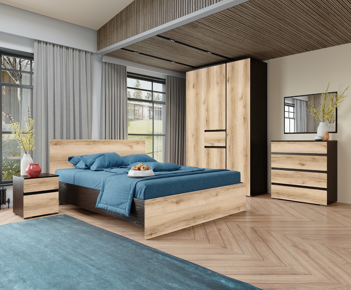 Спальный гарнитур Плейона — стильная и удобная в эксплуатации мебель с актуальным дизайном. Контрастные линии подчеркивают строгую геометрию, а древесные оттенки создают теплую и уютную атмосферу. Дверцы и ящики открываются за скошенные под углом торцы фасадов. Такое решение позволяет отказаться от выступающей фурнитуры.