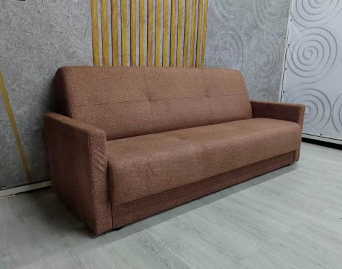 Диван трехместный компактного типа. Механизм трансформации «Книжка». Наполнитель:Пружинный блок, высокоэластичный ППУ, синтепон. Высота опоры/п.м./отступ от стены: 40/ 440 / 160 (мм.) Размер посадочного места: 1850*530 (мм.) Подлокотник: 100*730*600 (мм.) Бельевой ящик: 1700*670*160.