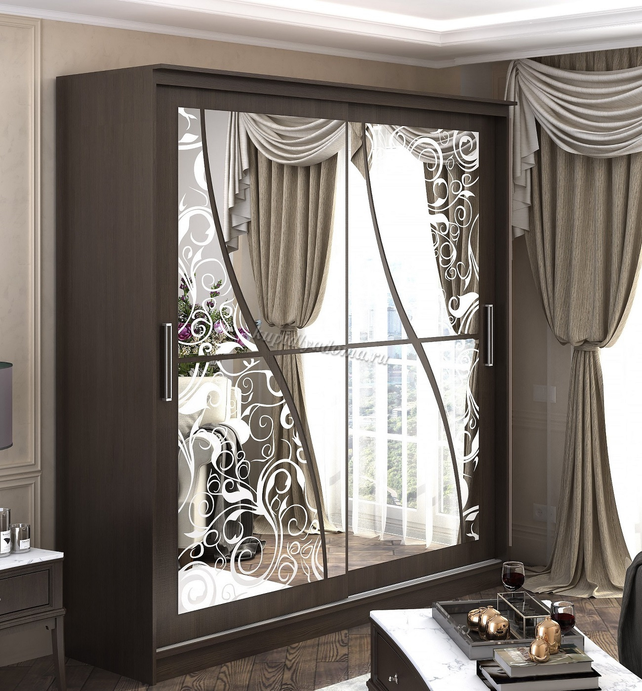 Двухдверный шкаф-купе с оригинальным узором на зеркале принесет неповторимый стиль и изысканность в интерьер квартиры. Богатое внутреннее наполнение изделия позволит содержать в порядке и сохранности множество вещей, одежды и обуви. Стильный и лаконичный дизайн шкафа станет ярким акцентом в вашем интерьере.